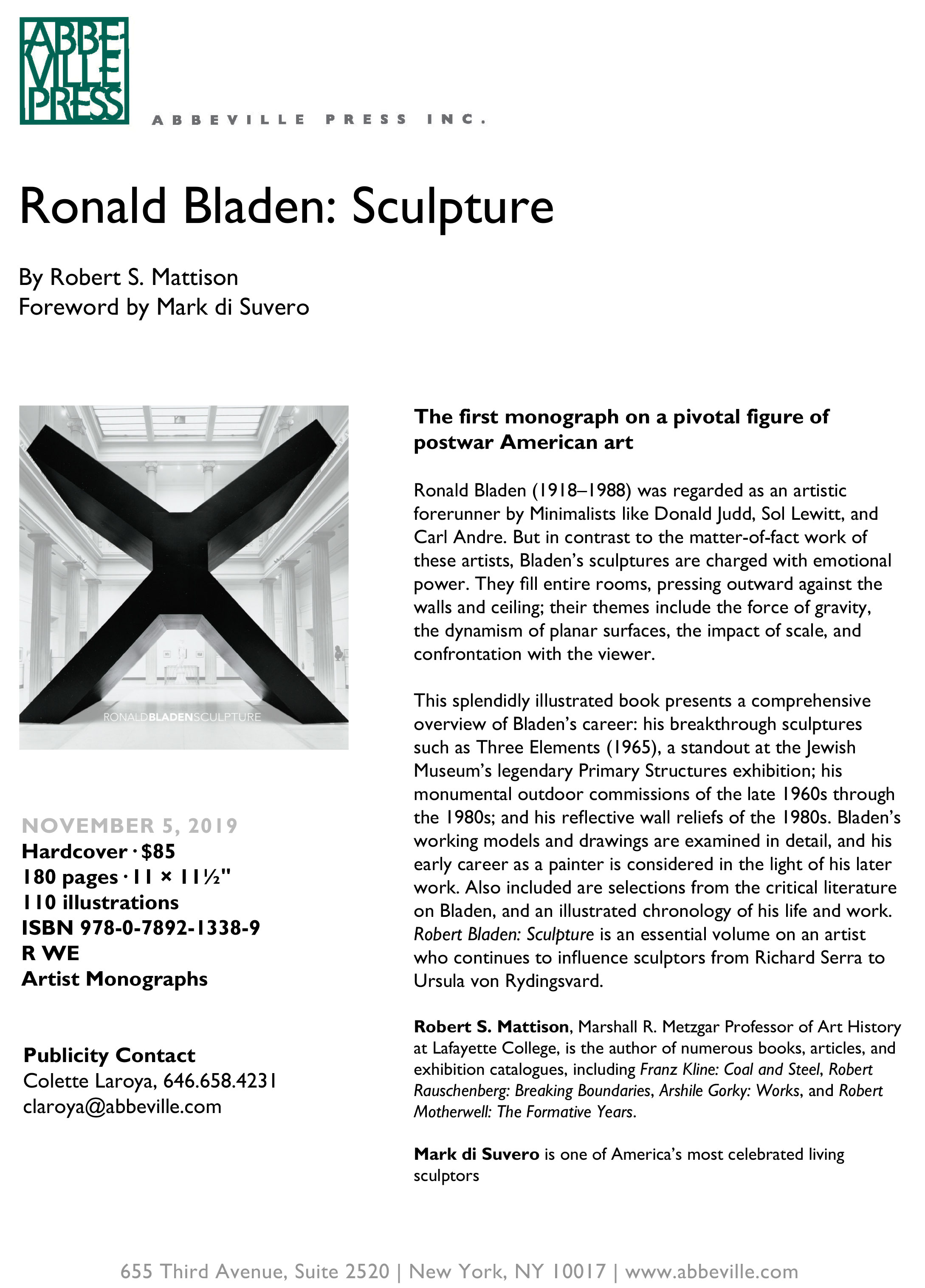 This splendidly illustrated book presents a comprehensive overview of Bladen's career; his breakthrough sculptures such as Three elements (1965), a standout at the Jewish Museum's legendary Primary Structures exhibition; his monumental outdoor commissions of the late 1960s through the 1980s; and his reflective wall reliefs of the 1980s. Bladen's working models and drawings are examined in detail, and his early career as a painter is considered in the light of his later work. Also included are selections from the critical literature on Bladen, and an illustrated chronology of his life and work. Ronald Bladen: Sculpture is an essential volume on an artist who continues to influence sculptors from Richard Serra to Ursula von Rydingvard.