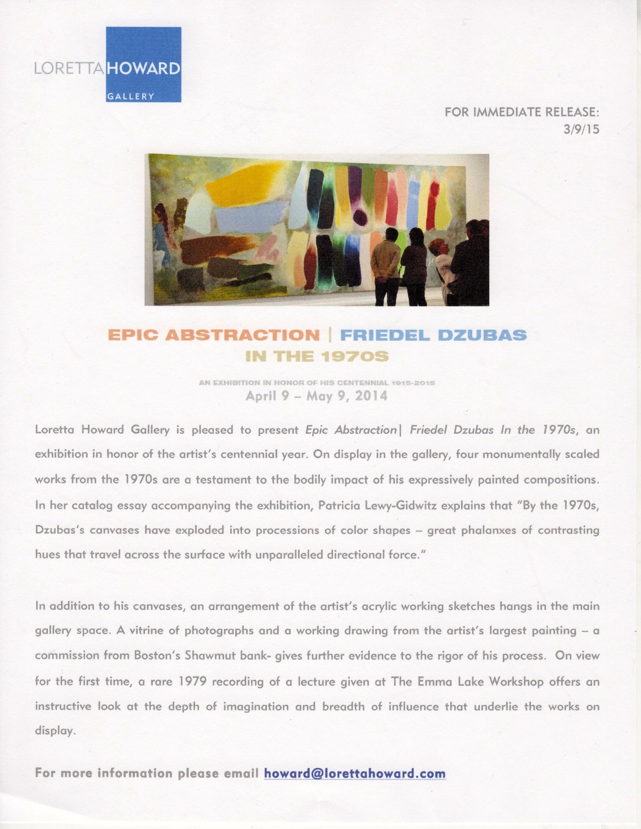 Loretta Howard Gallery is pleased to present Epic Abstraction: Friedel Dzubas in the 1970s, an exhibition in honor of the artist's centennial year. On display in the gallery, four monumentally scaled works from the 1970s are a testament to the bodily impact of his expressively painted compositions. In her catalog essay accompanying the exhibition, Patricia Lewy-Gidwitz explains that "By the 1970s, Dzubas's canvases have exploded into precessions of color shapes - great phalanxes of contrasting hues that travel across the surface with unparalleled directional force."